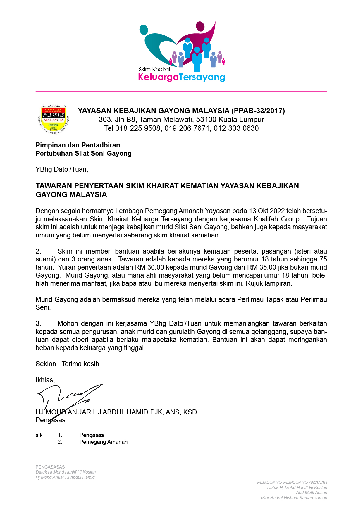 Segala urusan skim ini adalah dibawah tanggungjawab Yayasan Kebajikan Gayong Malaysia sepenuhnya.
